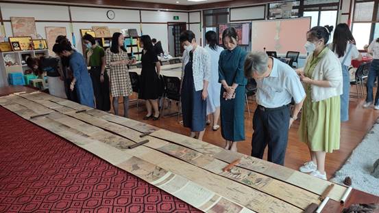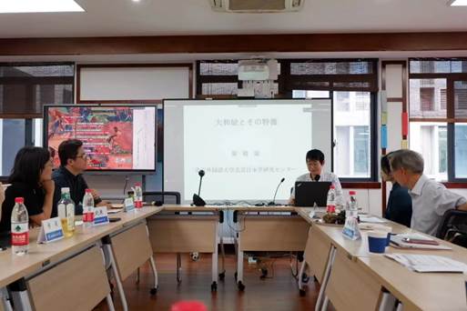 为配合此次讲演会的举办,张龙妹教授特地从北京带来《源氏物语绘卷》《紫式部日记绘卷》的复制件。利用会议的茶歇时间,张龙妹教授与参会师生共同欣赏了日本的国宝绘卷。下午第二场讲演,张老师以“大和絵とその特徴”为题,对日本的大和绘与中国古代绘画进行了特征上的比较与解析。讲演过程中,张老师耐心讲解了日本传统绘画的源流及基本技法、特色。张教授通过具体的绘卷实列向与会师生详细介绍了“左図右文”、“引目鉤鼻”、“吹抜屋台”、“異時同図”等日本绘卷研究中经常使用的重要概念。