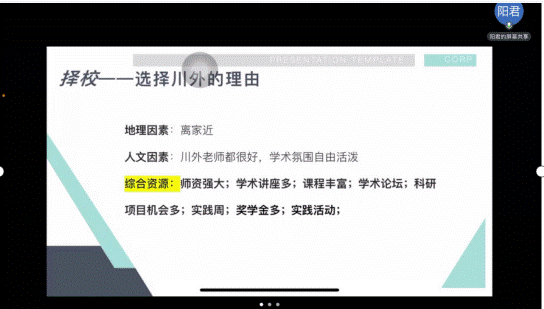 在往届优秀营员交流环节中,2019年优秀营员阳君同学结合自己的经历从团队、课程、学术活动、实践活动、奖学金政策以及如何就业等方面为营员们进行了分享。