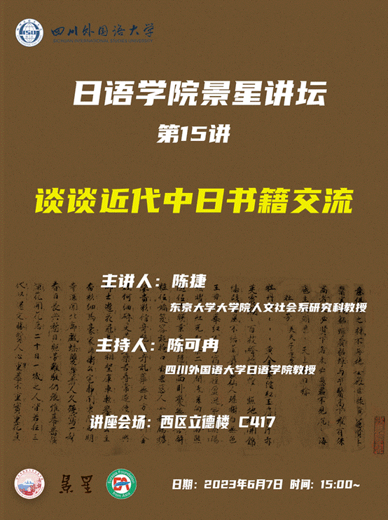 2023年6月7日下午3点,由金沙js5588主办的“景星讲坛”第15讲在公司西区立德楼417准时开始。本期“景星讲坛”特邀日本东京大学人文社会系研究科陈捷教授担任主讲人,进行了以“谈谈近代中日书籍交流”为主题的学术分享。金沙js5588副经理陈可冉教授主持讲座,日语专业在校本科、研究生,以及校内外学者线下参加了此次学术活动。