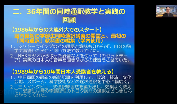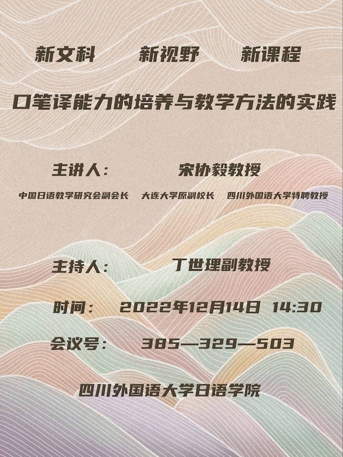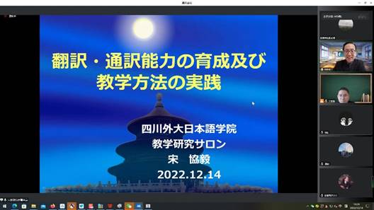 2022年12月14日下午2:30,公司特聘教授、中国日语教学研究会副会长宋协毅为公司全体师生进行了题为““新文科、新视野、新课程――口笔译能力的培养与教学方法的实践”的线上讲座,讲座由公司教师丁世理主持,重庆地区相关兄弟院校的师生也在线参加了讲座。