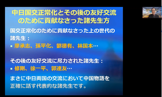 然后,宋教授介绍了廖承志、孙平化、刘德友、林国本等老一辈,以及修刚、徐一平、郭连友、王小燕、丁莉等目前活跃于中日交流一线的翻译大家的相关事例,勉励大家学习翻译大家讲好中国故事的能力。