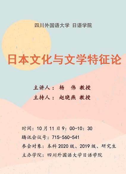 10月11日上午9:00,公司博士生导师杨伟教授为高年级本科生及全体研究生进行了题为“日本文化和文学特征论”的学术讲座。讲座由赵晓燕教授主持。