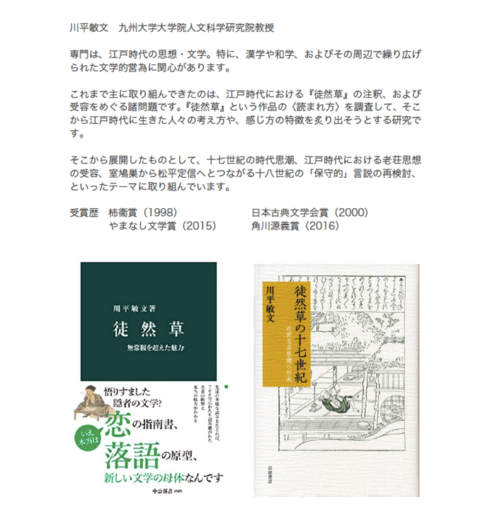 川平教授在对俳谐的历史进行追溯前,首先简单介绍了属于“雅文化”的和歌、连歌,以及属于“俗文化”的俳谐。接着按照贞门俳谐、谈林俳谐、蕉风俳谐的顺序对俳谐的历史发展演变进行解说。其中,贞门俳谐肯定徘谐的价值,认为和歌连歌需要古文知识素养,而俳谐以其简单、通俗、诙谐的特点便于大众参与其中,因此具有超越连歌的价值;谈林俳谐认为俳谐重视“无心所着”(意义不明)、虚构的事物,幽默风趣、引人入胜而又具有禅意、使人豁然开朗;蕉风俳谐以松尾芭蕉为中心,其中川平教授先以汉文书写的俳句为例,具体阐释了将汉诗文引入俳句这一汉诗与俳谐相融合的“新形式”俳句,接着征引各学者文章为例,论证了后期芭蕉“かるみ”的内核实质来自汉诗中的“洒落”。
