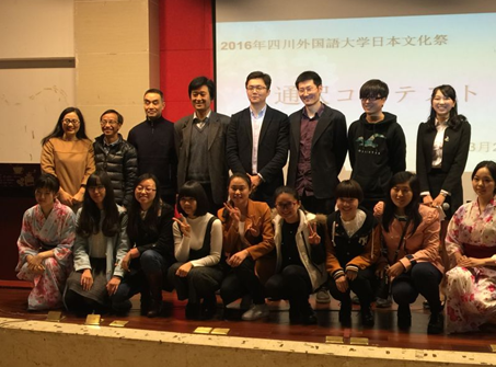 比赛开始前,主持人用流畅的日语向大家介绍了比赛规则及莅临活动现场的各位评委。担任评委的老师有系副主任陈可冉副教授、姚继中教授、杨伟教授、晋学新教授、王宗瑜副教授、唐先荣副教授、杨爽老师7位老师。