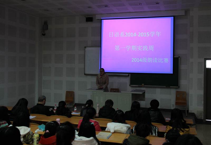 2014年12月14日,日语系迎来了2014-2015学年第一学期的实践周暨2014级新生日语朗读比赛活动。本次比赛由吴兴华老师、姚继中老师、张颖老师、赵婉老师、群英老师、毛青兰老师和山口老师担任评委。共有16名选手和4名挑战者参加了朗读比赛的角逐。选手们对这次比赛都非常的重视,赛前都做了充分的准备。从我身边的例子说起,我同班的四个参加比赛的同学,每天除了完成正常的课业,课下还积极主动找老师给她们辅导。她们不仅要自己找文章,熟悉生词,还要背诵整篇文章,反复练习句子的语音语调,有的还要加入自己的表演,或是为自己的朗读寻找合适的背景音乐。一班的孙佳瑞同学虽然生病了,但她依然坚持参加比赛,在台下还是很虚弱的样子,一上台就立马打起精神。她坚持不懈的精神真的非常值得我们学习。