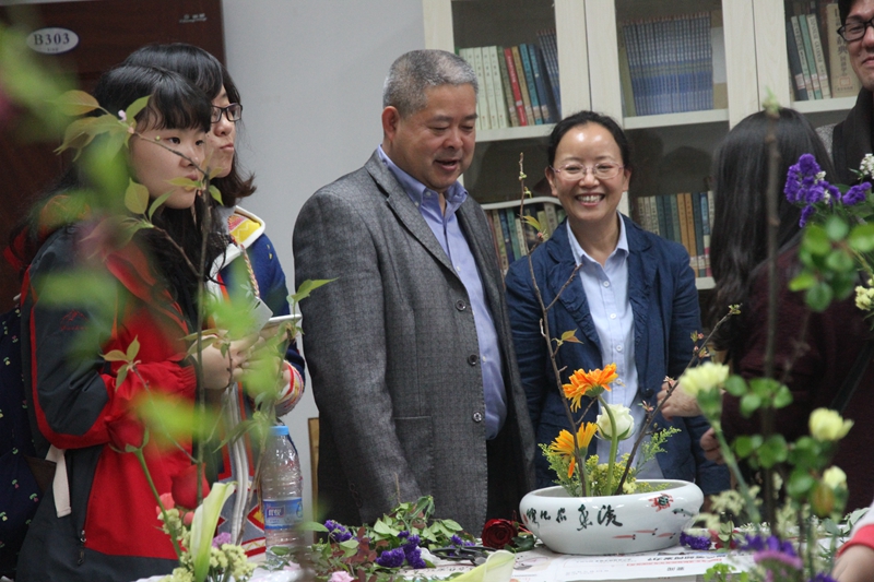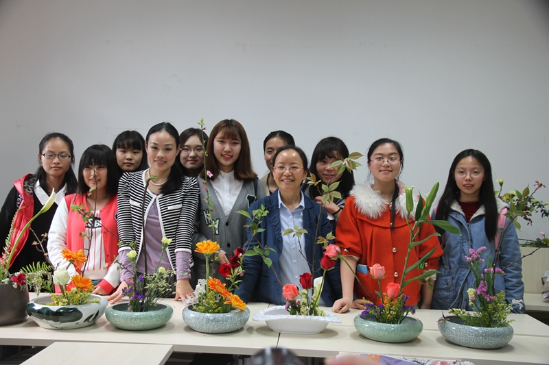 参加花道的不只有日语系本系的同学,还有很多来自其他院校的同学们,她们大多都是第一次接触花道,不懂得花道的种种规则和分类,经过管老师的指导,同学们了解到了花道“立花”和“生花”的分类,以及“池坊流”,“草月流”等流派。不仅在视觉上得到了满足,更是自己动手,身临其境的感受了花道的魅力。完成之后,群英老师又悉心点评了每组同学的作品,并帮同学们拍照留念。每组作品最后都被送往日语系各办公室进行展览,过程虽短,但花香和人情久存。